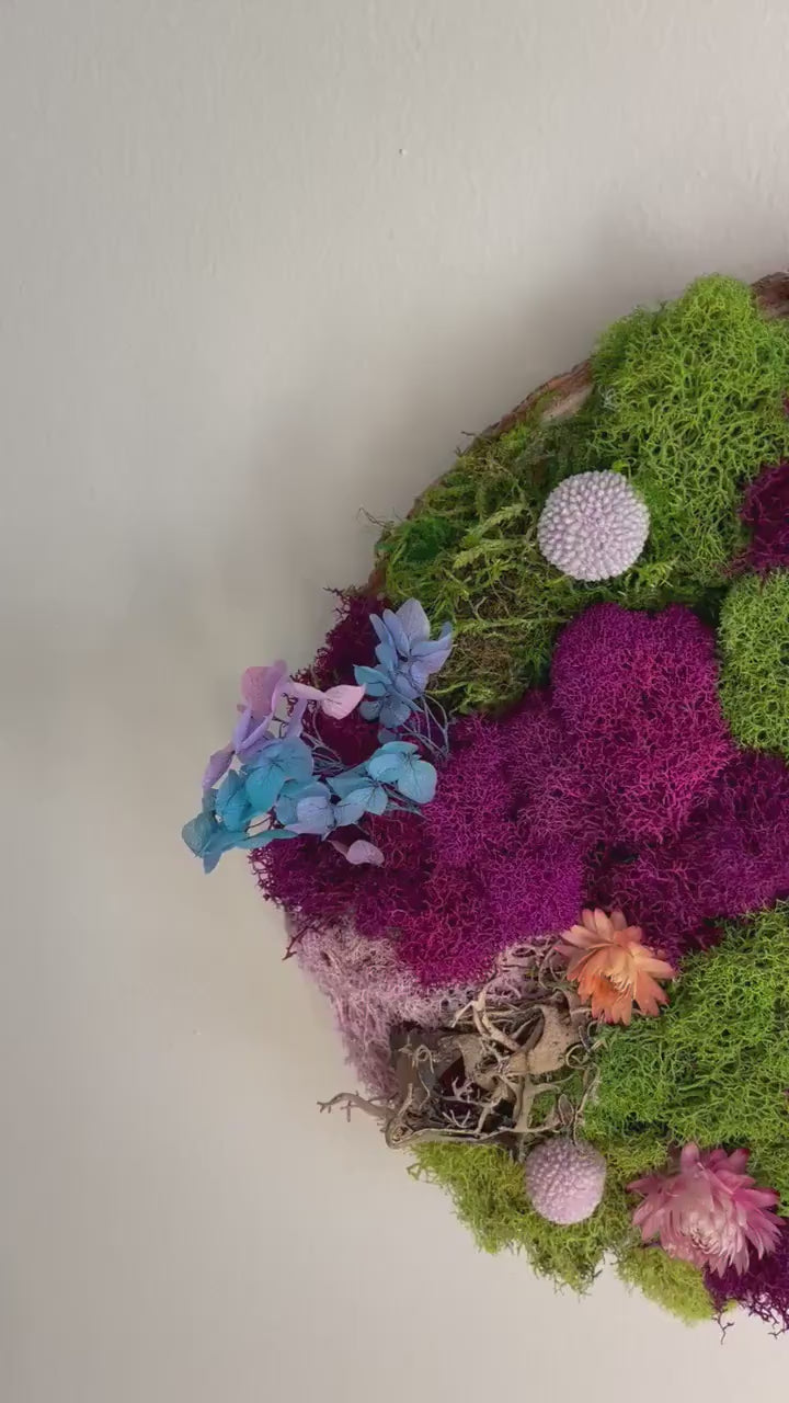 Moss Art on Wood Slice – Purple Meadows Nature Wall Decor (10x10”)