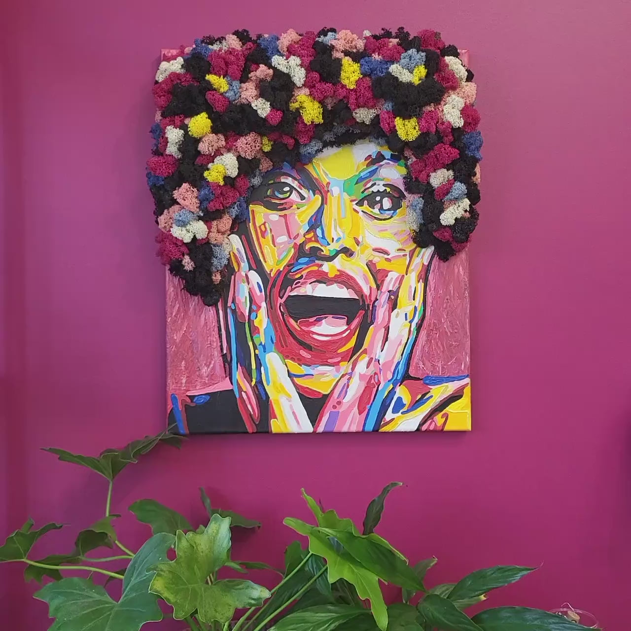 Elevate your home with Rhythms of Joy, a handcrafted moss painting that beautifully merges art and nature. Featuring a vibrant woman’s portrait adorned with eco-friendly colored moss, this wall decor brings warmth, elegance, and serenity to any interior. Each detail is carefully hand-painted and textured with preserved moss to create a one-of-a-kind visual masterpiece.