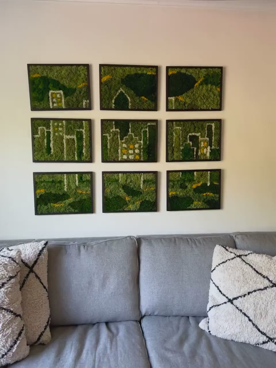 Moss Wall Art – Preserved Moss Wall Decor with Nine Rectangle Wood Frames | City Skyline Design