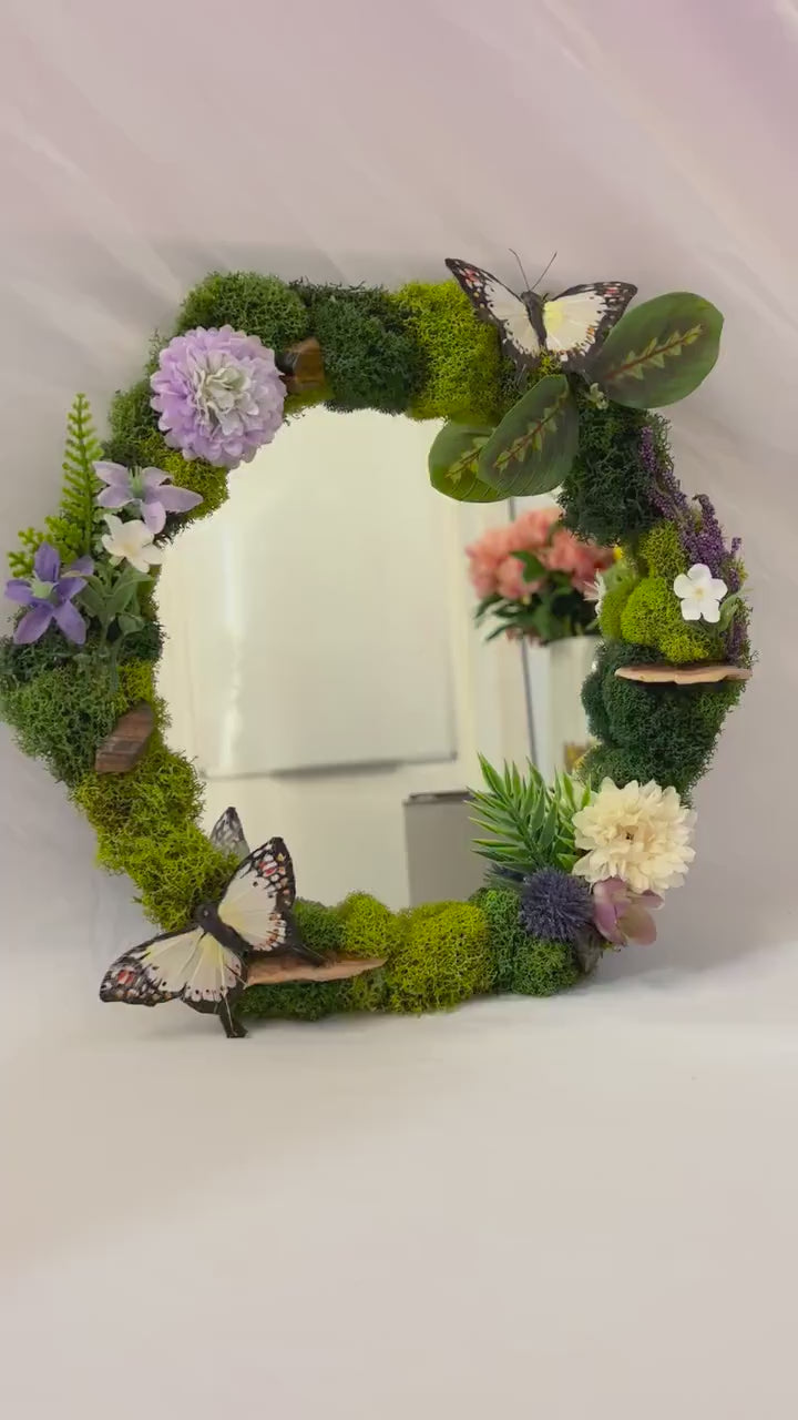 Preserved Moss Mirror – Butterfly Fairy Crystal Mirror Art (White & Purple)