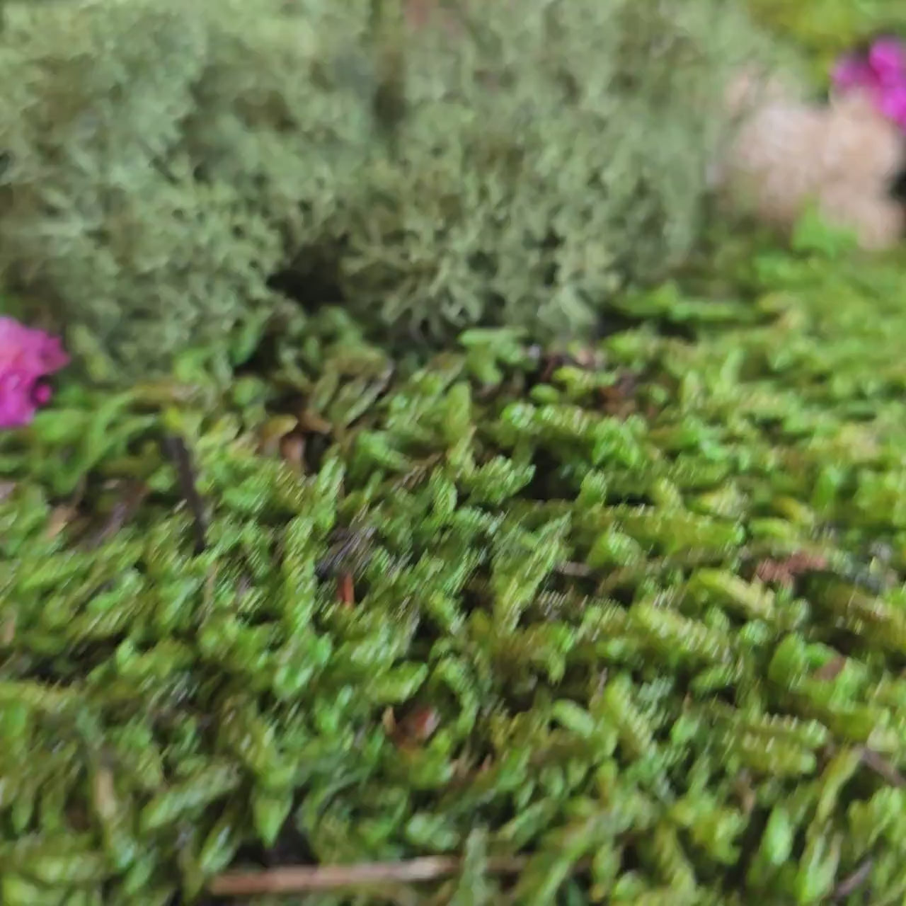- Materials: preserved reindeer moss, flat sheet moss, bun/ball moss, dried florals, natural wood frame