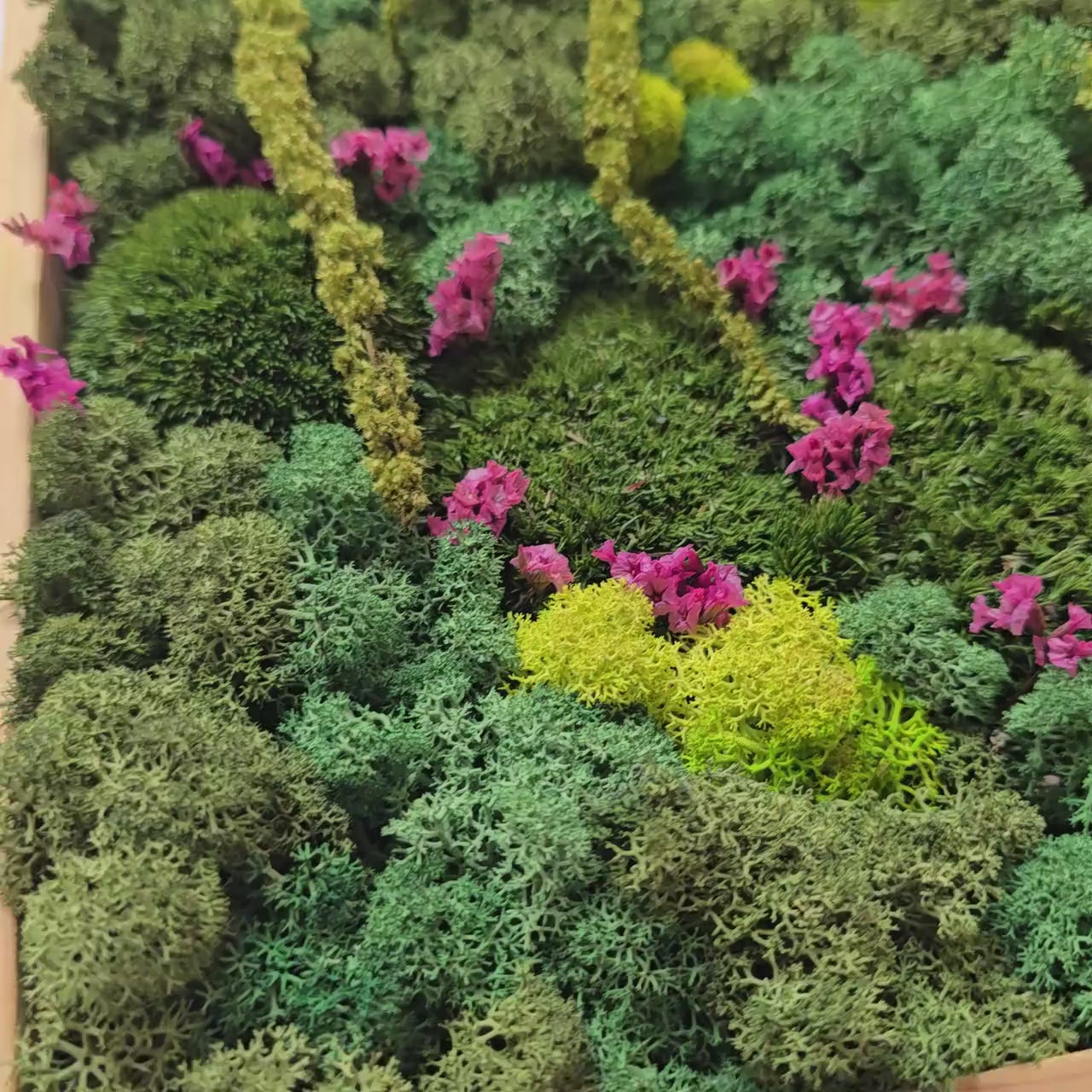 🟢 Materials: preserved Scandinavian/reindeer moss, stabilized amaranth, dried florals, natural wood frame, non-toxic adhesive
