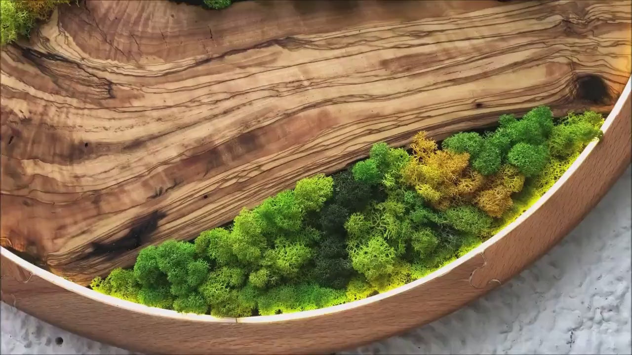 - Materials: Beech wood, olive wood, preserved moss, LED lighting